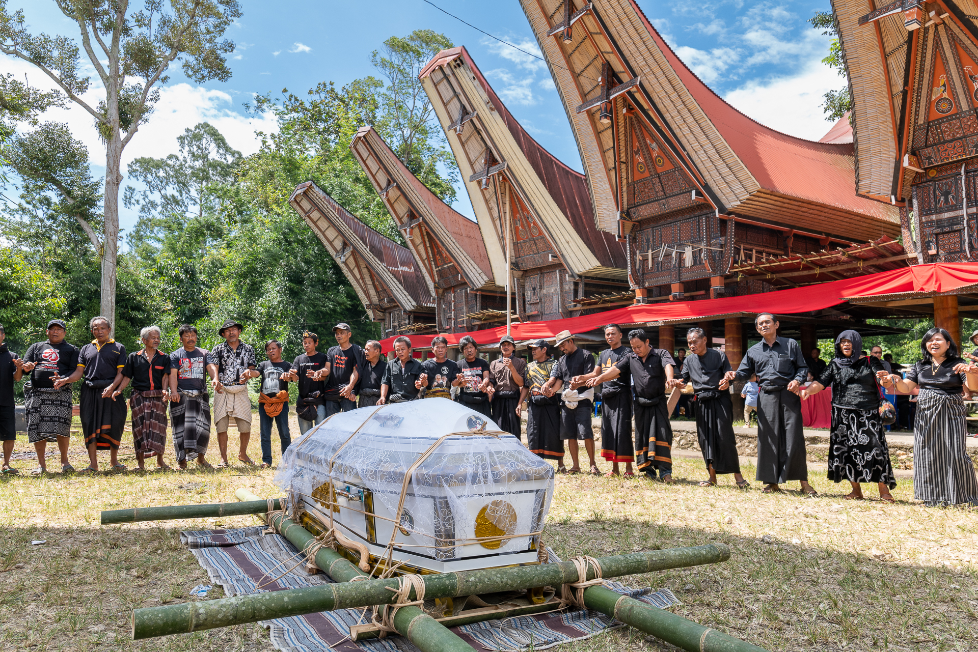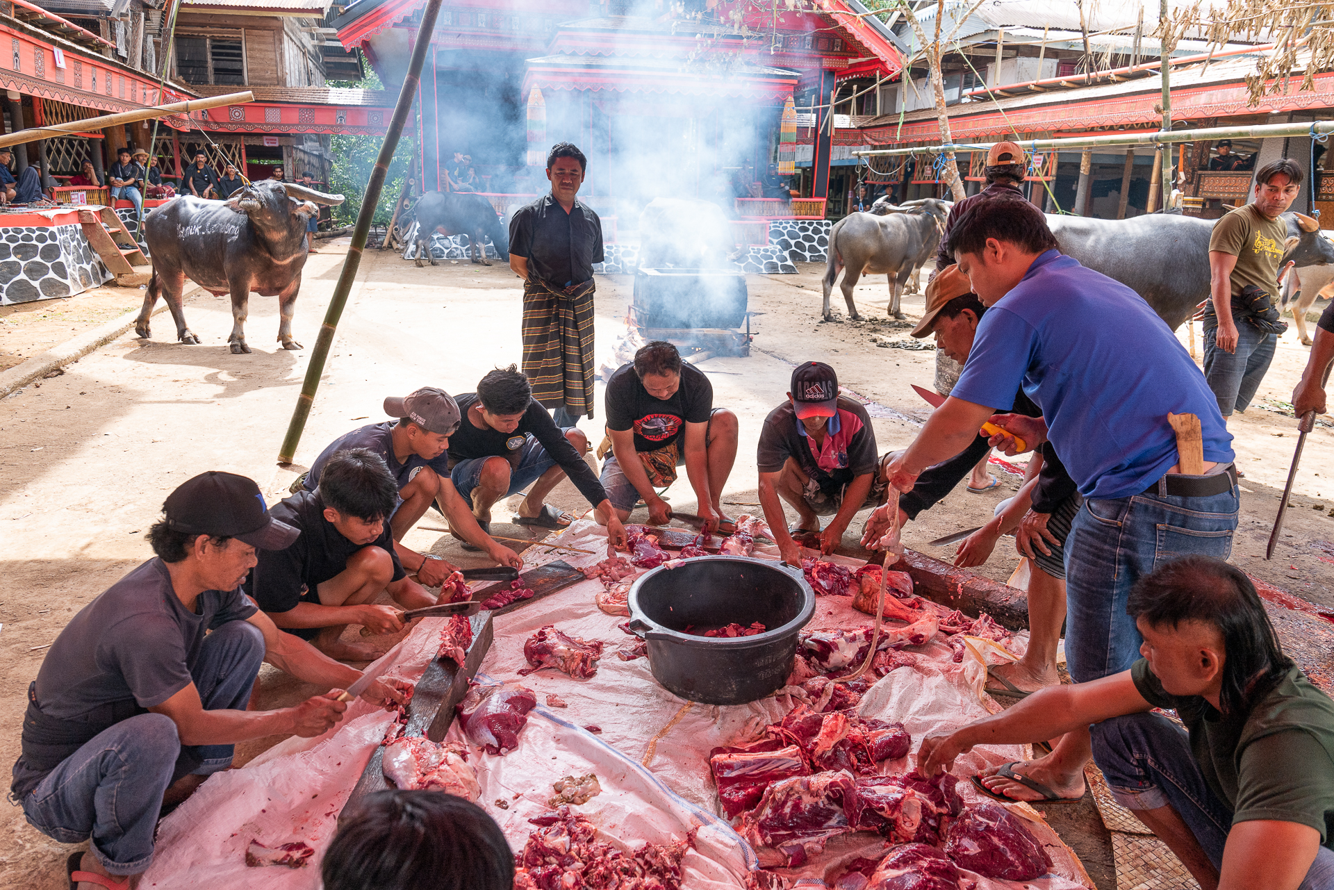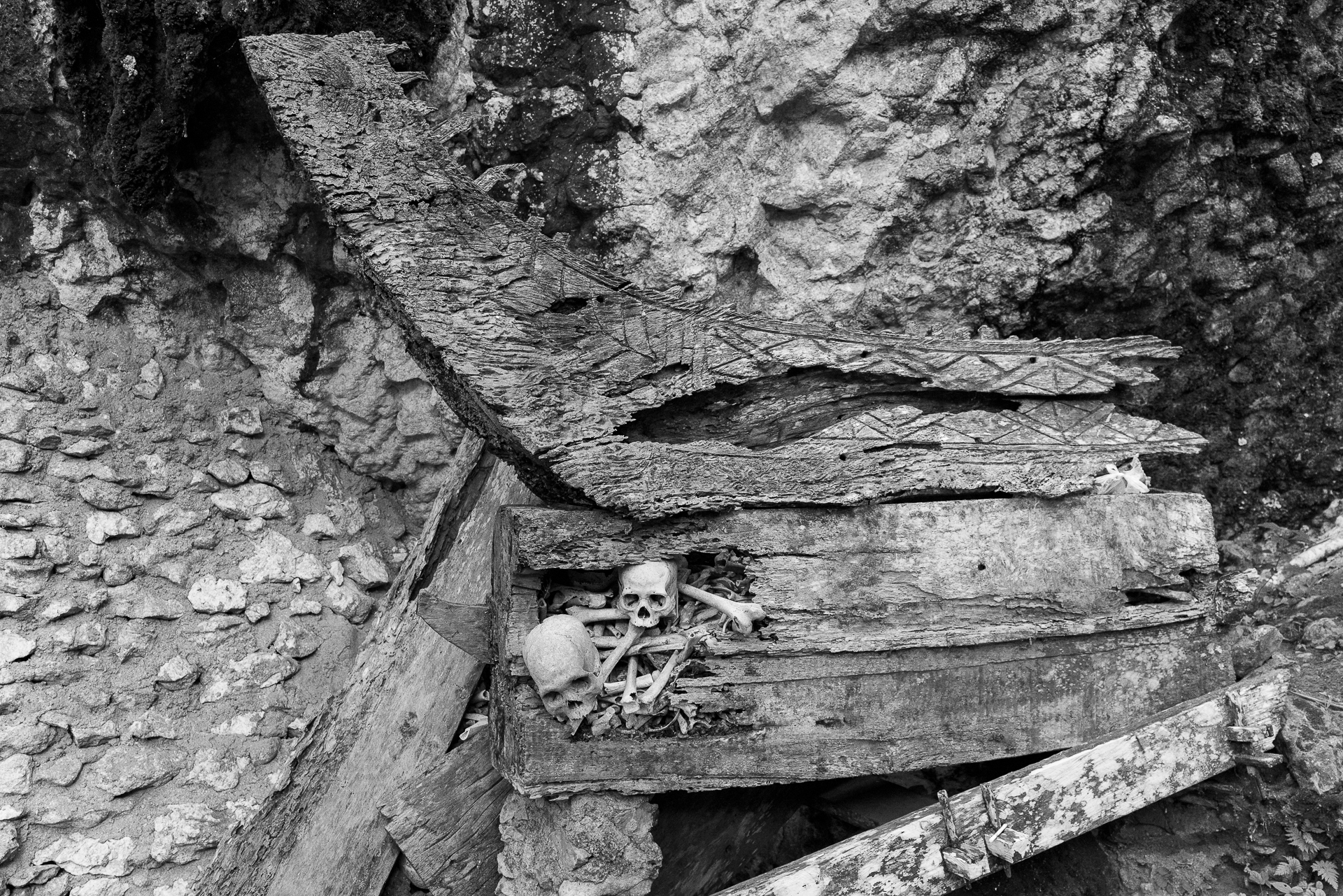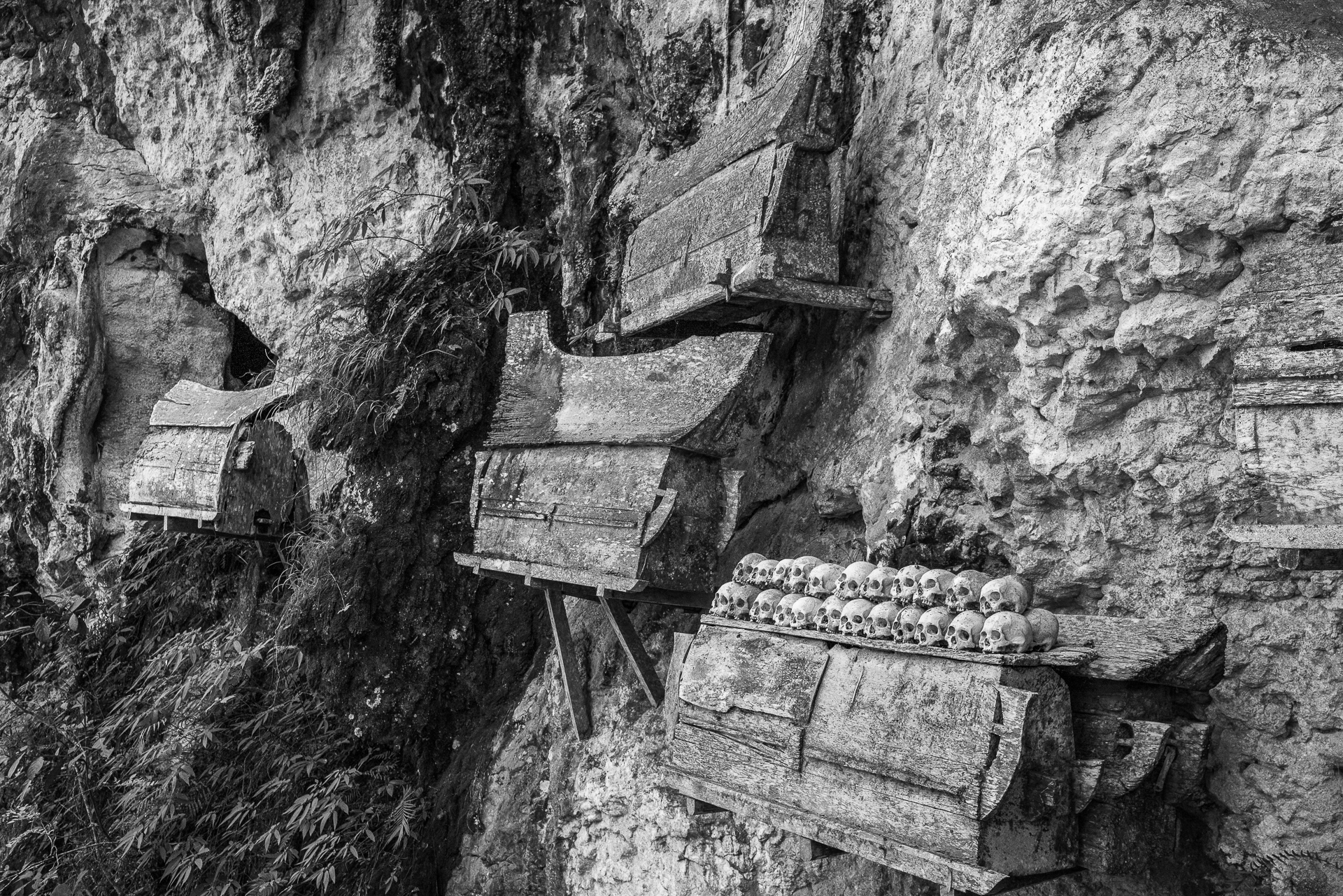 Im Hochland von Tana Toraja verändert sich alles. Die Landschaft wird dramatisch, die Luft kühler. Hier begegnen wir zuerst dem Tod. Ich fotografiere Totenfeiern, die sich über mehrere Tage erstrecken. Verstorbene bleiben oft monatelang oder jahrelang im Haus der Familie. Einbalsamiert. Versorgt. Anwesend. Die Zeremonien sind groß, intensiv, gemeinschaftlich. Büffel und Schweine werden geopfert und der Abschied wird sichtbar. Christine und ich besuchen zahlreiche Grabstätten, einige davon hunderte Jahre alt. Kete Kesu und Londa ist einer der bedeutendsten Orte. Bis zu 800 Jahre alte Särge hängen regungslos an einer steilen Felswand. Totenschädel sind allgegenwärtig, offen und sichtbar. Der Tod ist hier kein Ende, sondern Erinnerung.