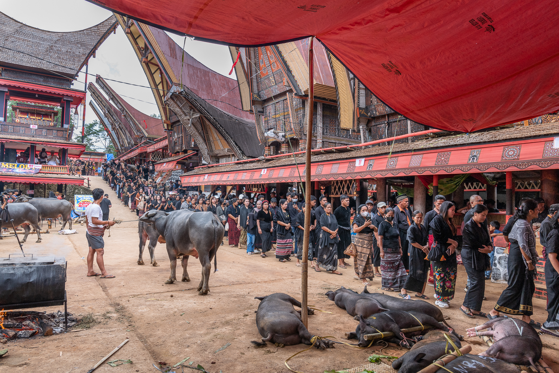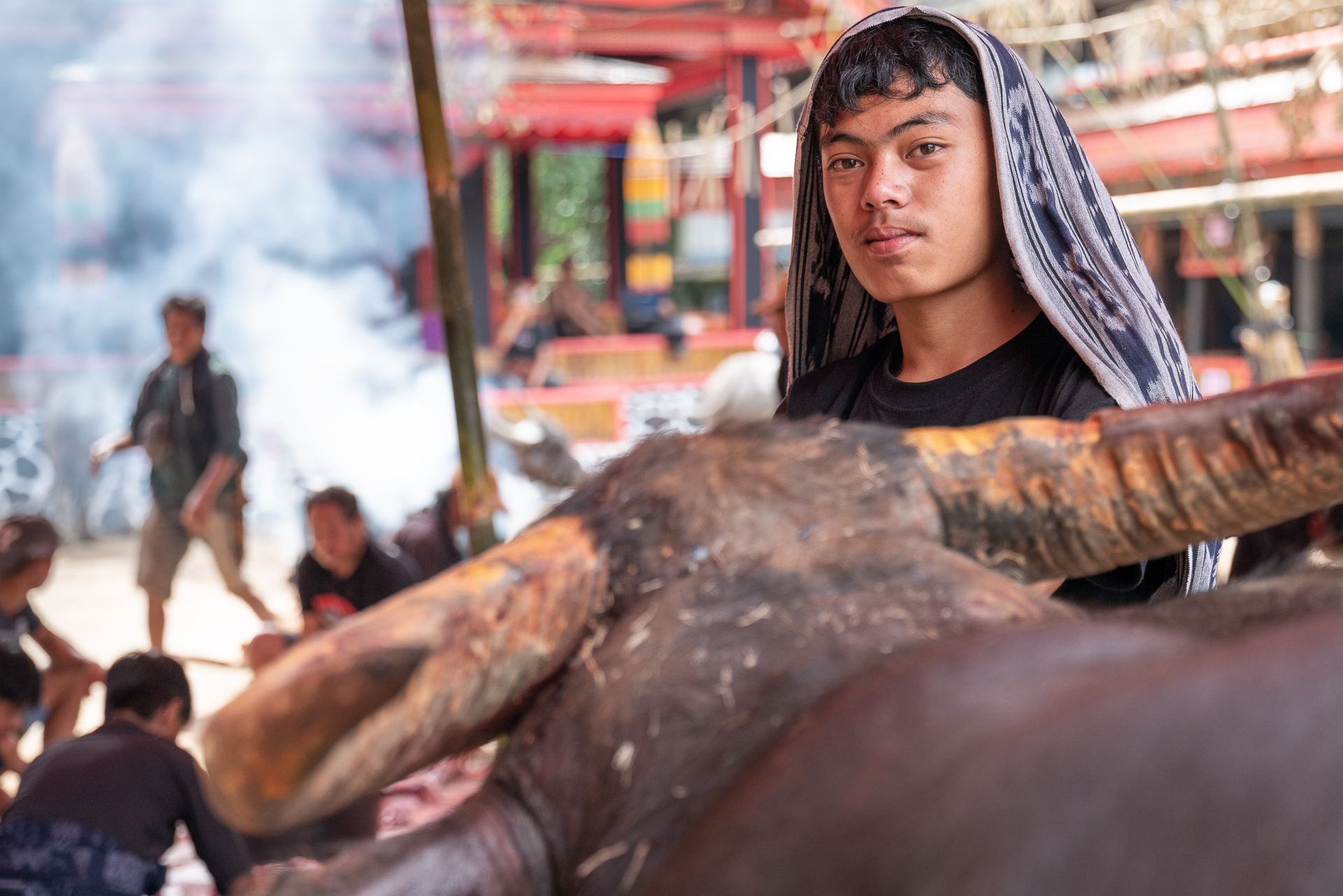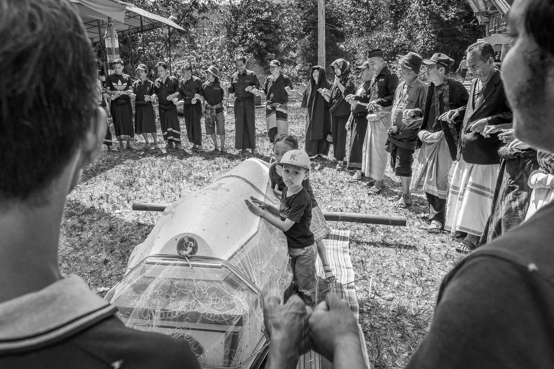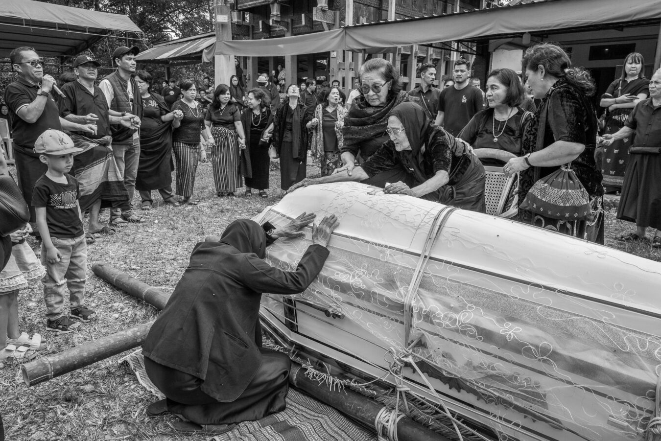 Im Hochland von Tana Toraja verändert sich alles. Die Landschaft wird dramatisch, die Luft kühler. Hier begegnen wir zuerst dem Tod. Ich fotografiere Totenfeiern, die sich über mehrere Tage erstrecken. Verstorbene bleiben oft monatelang oder jahrelang im Haus der Familie. Einbalsamiert. Versorgt. Anwesend. Die Zeremonien sind groß, intensiv, gemeinschaftlich. Büffel und Schweine werden geopfert und der Abschied wird sichtbar. Christine und ich besuchen zahlreiche Grabstätten, einige davon hunderte Jahre alt. Kete Kesu und Londa ist einer der bedeutendsten Orte. Bis zu 800 Jahre alte Särge hängen regungslos an einer steilen Felswand. Totenschädel sind allgegenwärtig, offen und sichtbar. Der Tod ist hier kein Ende, sondern Erinnerung.