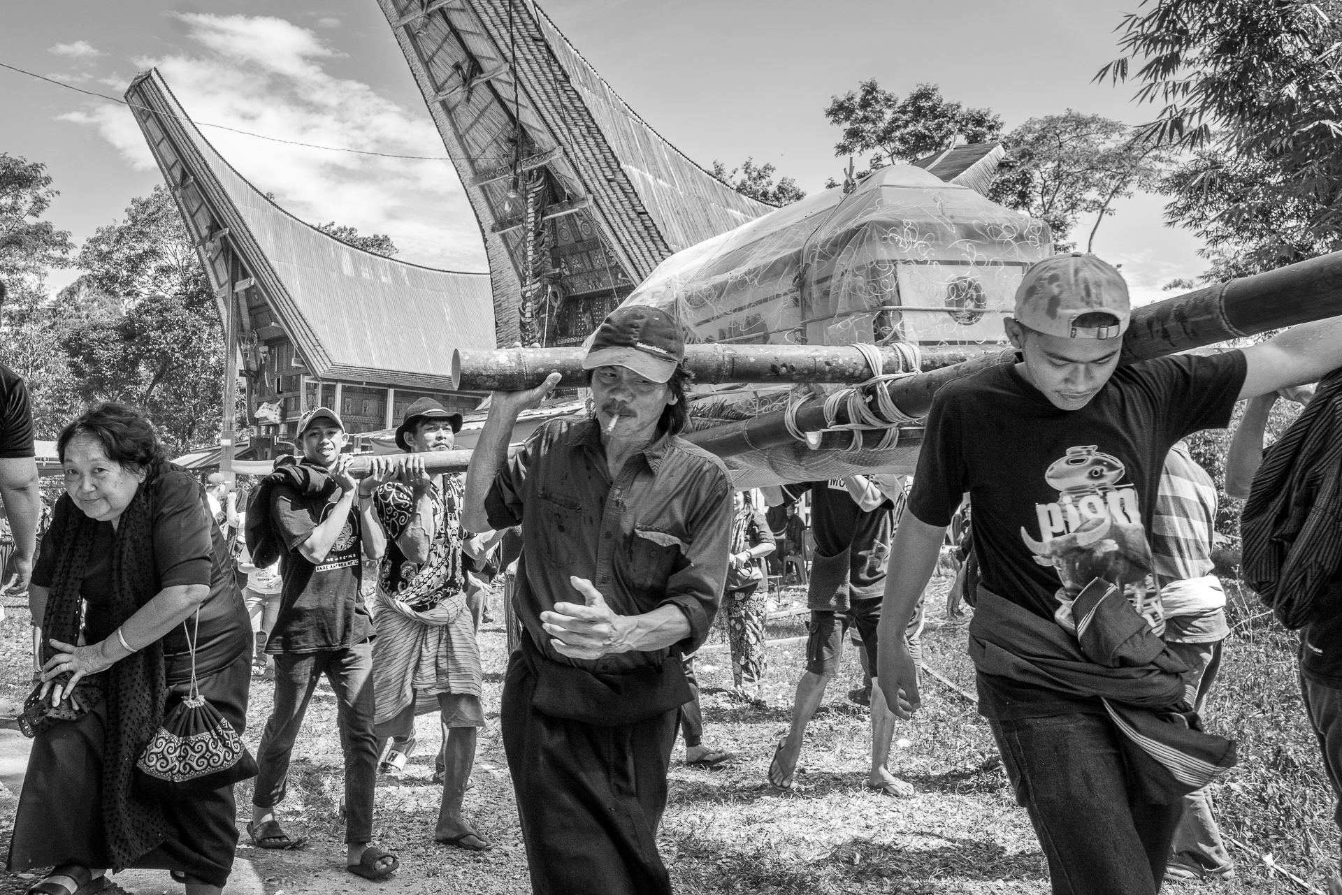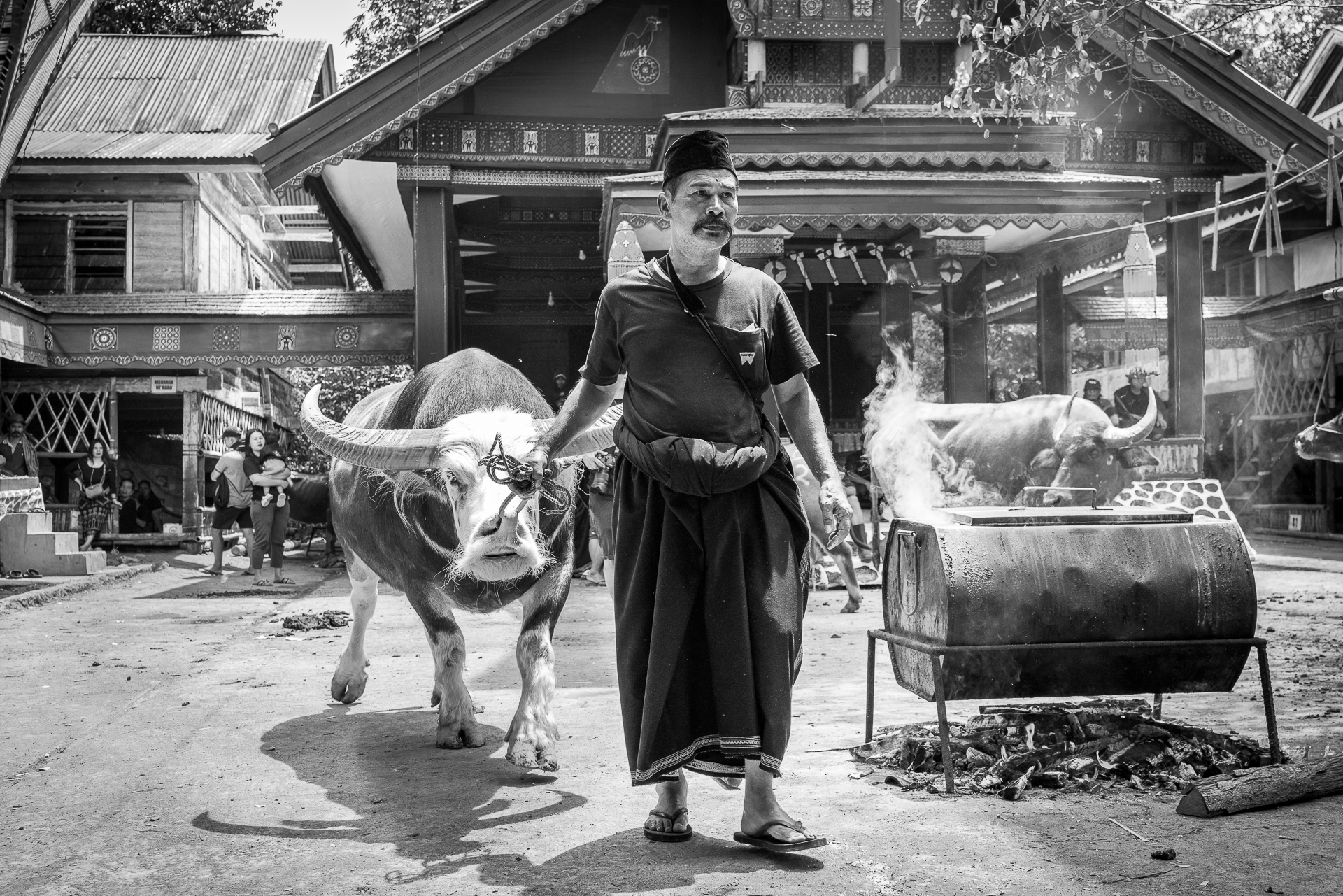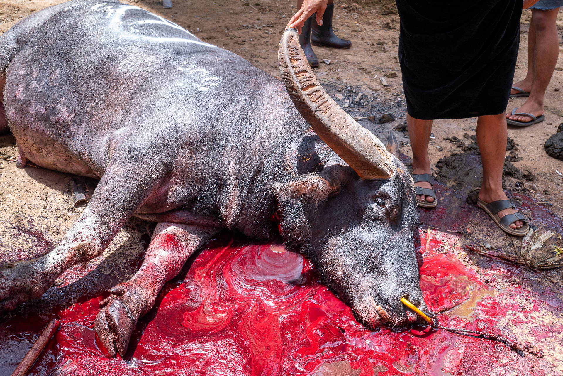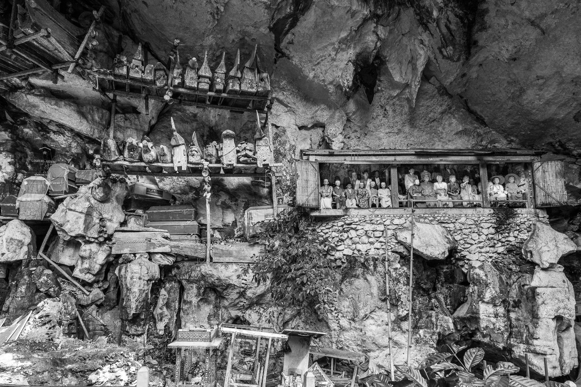 Im Hochland von Tana Toraja verändert sich alles. Die Landschaft wird dramatisch, die Luft kühler. Hier begegnen wir zuerst dem Tod. Ich fotografiere Totenfeiern, die sich über mehrere Tage erstrecken. Verstorbene bleiben oft monatelang oder jahrelang im Haus der Familie. Einbalsamiert. Versorgt. Anwesend. Die Zeremonien sind groß, intensiv, gemeinschaftlich. Büffel und Schweine werden geopfert und der Abschied wird sichtbar. Christine und ich besuchen zahlreiche Grabstätten, einige davon hunderte Jahre alt. Kete Kesu und Londa ist einer der bedeutendsten Orte. Bis zu 800 Jahre alte Särge hängen regungslos an einer steilen Felswand. Totenschädel sind allgegenwärtig, offen und sichtbar. Der Tod ist hier kein Ende, sondern Erinnerung.