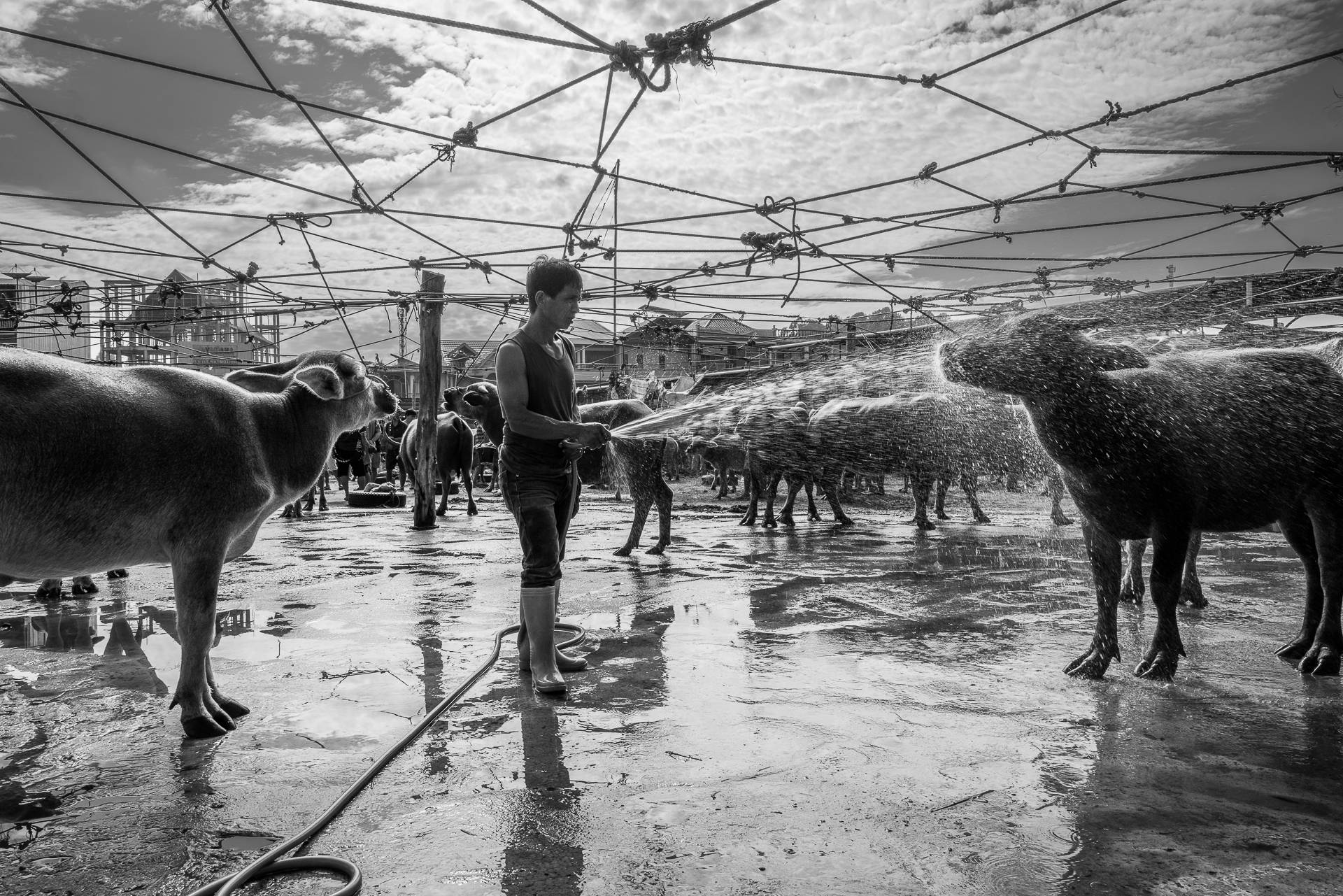 Sulawesi liegt im Übergangsbereich zwischen dem Pazifik und Indischen Ozean. Die indonesische Insel ist rau und abgelegen. Die Insulaner sind außergewöhnlich freundlich, herzlich und hilfsbereit. Sie begegnen uns mit ehrlichem Interesse und großer Offenheit. Von Makkasar führt uns ein kleine Straße nach Sengkang, über schlechte Pisten, vorbei an Dörfern, Feldern, Menschen. Wir leben einige Tage auf einem Floating House auf dem Lake Tempe. Fischer ziehen im Morgengrauen ihre Netze ein. Wir bewegen uns leise durch diesen Alltag. Wir beobachten. Ich fotografiere Menschen in ihrem Umfeld – ohne Inszenierung.